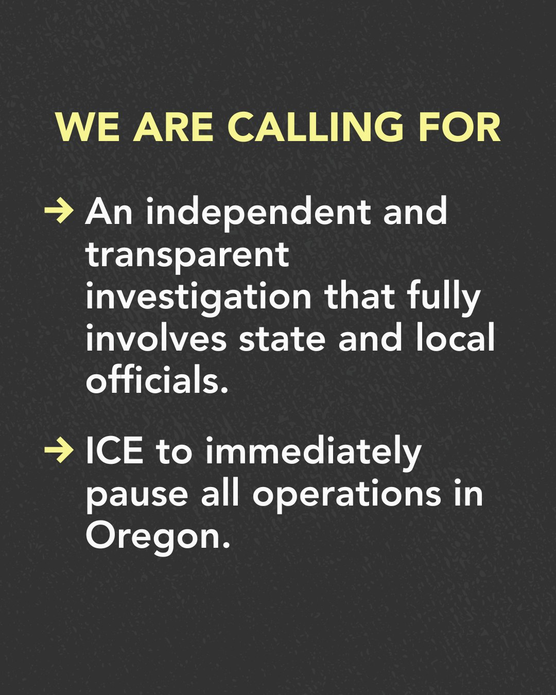 The presence of immigration agencies that hurt people and break up families puts all of us in danger. We are calling for ICE to immediately pause all operations in Oregon. And we support an independent, transparent investigation into the recent shooting of two people by federal agents in East Portland.