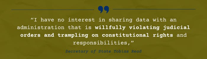 WHAT'S HAPPENING: The State of Oregon administers free and fair vote-by-mail elections, not the federal government. Yet last month, the Trump Regime’s Department of Justice requested sensitive voter data from states. This week, Oregon’s Secretary of State responded, rejecting attempts to obtain Oregonians’ personal data and affirming Oregon’s oversight of our state elections.